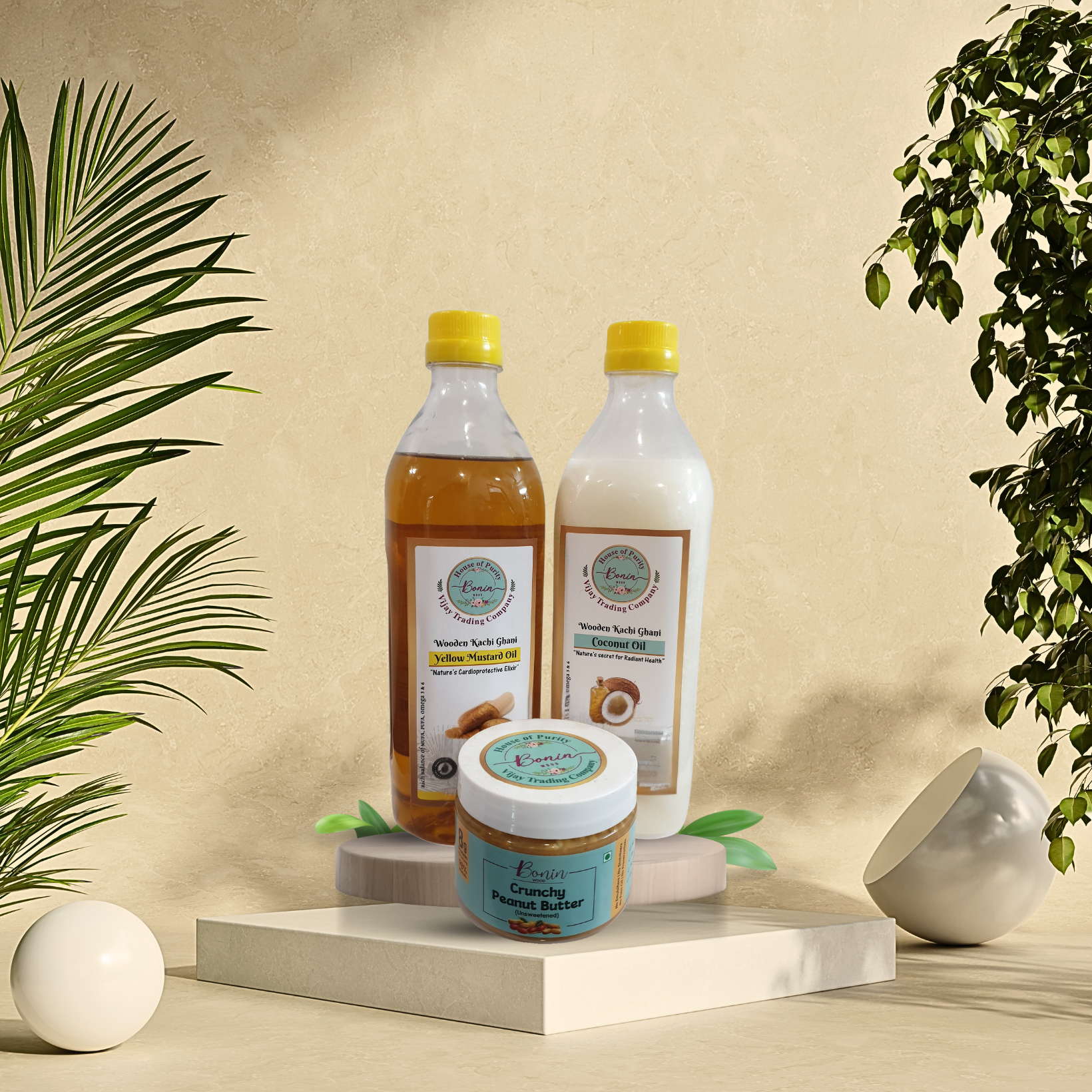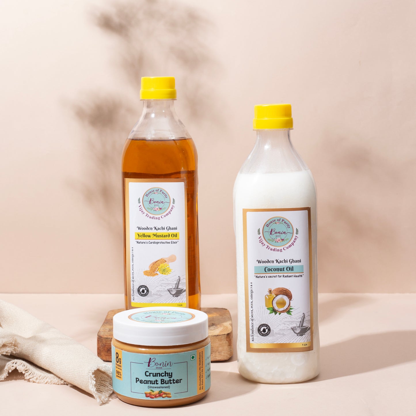 Yellow Mustard Oil 1 ltr, Coconut Oil 1 ltr , Crunchy Peanut Butter 350gm